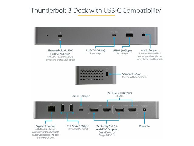 StarTech.com Dock Thunderbolt 3 Compatible Hôte USB-C - Écrans Double 4K 60Hz DP 1.4 ou Double HDMI - Simple 8K - Station d'Acceuil TB3/USB-C - 96W PD, 5xUSB - 10Gbps (TB3CDK2DHUE) - Station d'accueil - USB-C 3.2 Gen 2 / Thunderbolt 3 - 2 x HDMI, 2 x DP - 1GbE