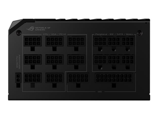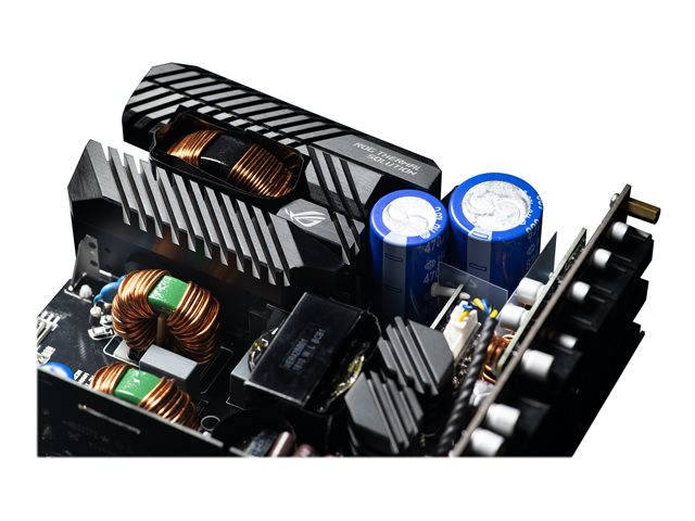FonctionsCâbles à manchon, protection contre les surintensités, protection contre les surtensions, protection de surtension, protection de court-circuit, protection thermique, affichage OLED, entièrement modulaire, ASUS Aura Sync, refroidissement de 0 dB avec ventilateur à ailettes IP5X antipoussière, dissipateur thermique ROG