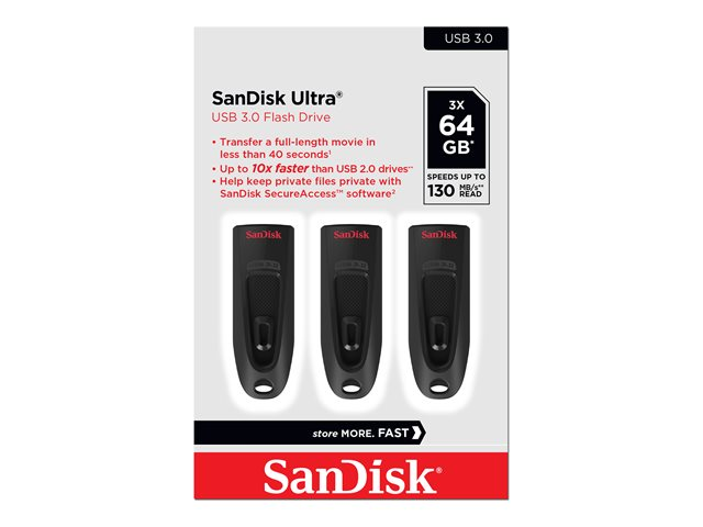 La clef USB 3.0 SanDisk Ultra allie des débits de données plus rapides et une capacité généreuse dans un ensemble compact et élégant. Passez moins de temps à attendre et transférez des fichiers vers le lecteur jusqu'à dix fois plus rapidement qu'avec une clef USB 2.0. Avec des capacités de stockage, le lecteur peut accueillir vos fichiers multimédias et documents les plus volumineux.