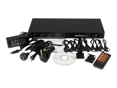 Le commutateur de matrice HDMI et extendeur de Cat5 ST424HDBT propose une solution complète d'affichage numérique qui vous permet de prolonger jusqu'à 70,1 mètres quatre sources audio/vidéo HDMI distinctes vers quatre affichages distants par le biais de récepteurs STHDBTRX (vendus séparément). La commutation de matrice permet à chacun des affichages distants d'envoyer des signaux vidéo et de passer d'une source à l'autre.